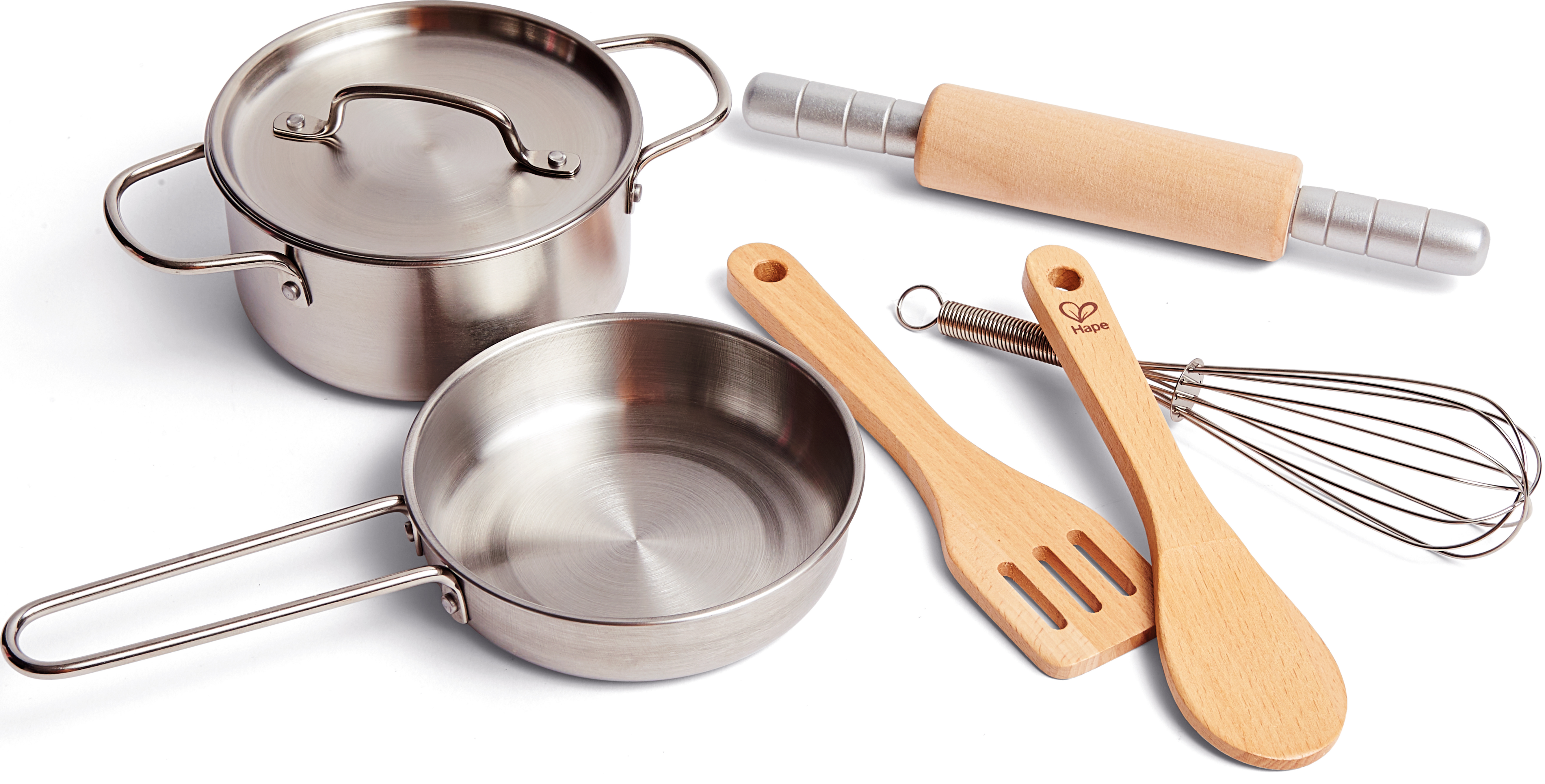 Set de cocina de siete piezas ideal para juegos de rol. Incluye sartenes, rodillo y más, fomentando la imaginación y la narración. Diseñado para niños desde tres años, fabricado con materiales sostenibles y seguros. Cumple con estándares internacionales de calidad, perfecto para preparar comidas de fantasía con creatividad.