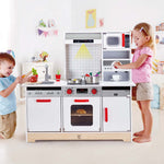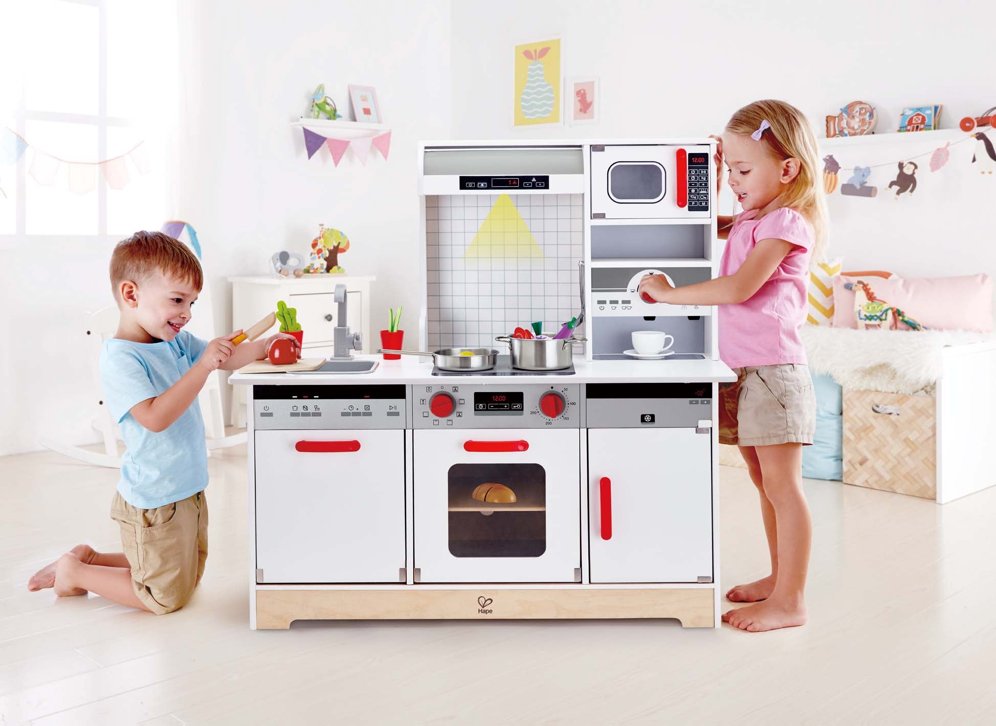 Esta cocina completa estimula la creatividad y el juego colaborativo con electrodomésticos funcionales, campana extractora y microondas con sonido real. Los niños experimentan roles del hogar, fortalecen habilidades sociales y practican la secuencia de acciones. Hecha con materiales duraderos, es ideal para jardines infantiles y espacios educativos desde los 3 años.