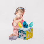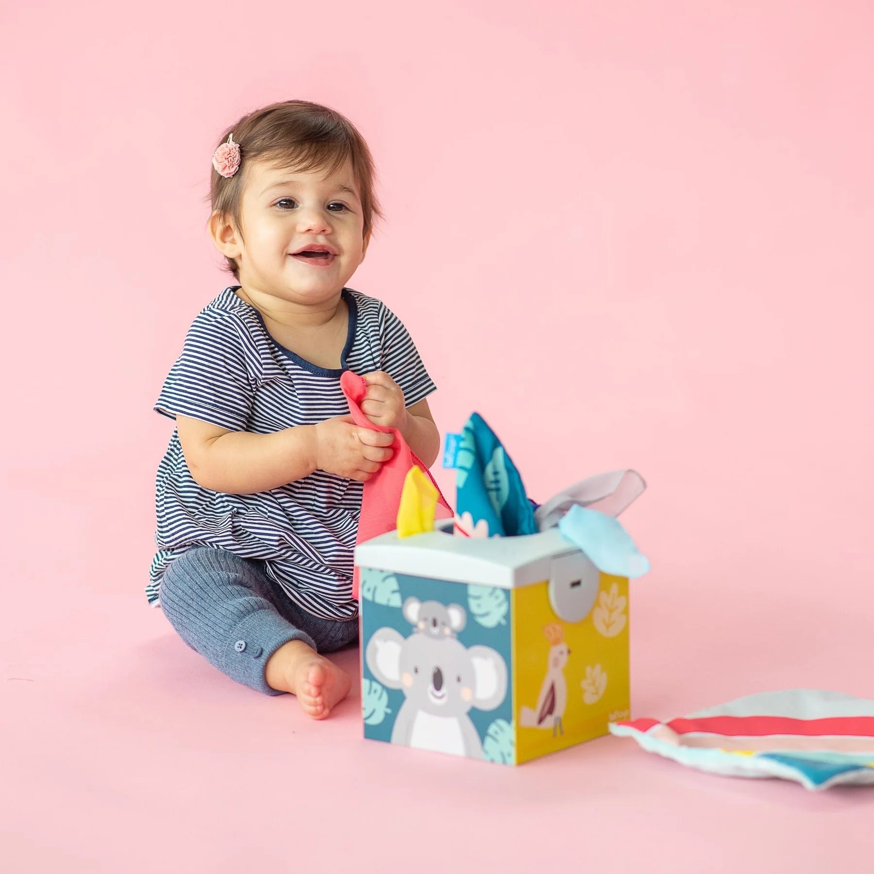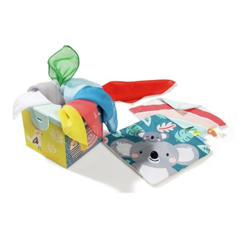 Esta caja sorpresa está diseñada para estimular el sentido del tacto y la motricidad fina del bebé. Incluye 8 telas de organza y 2 de papel suave y crujiente, ideales para que el bebé explore diferentes texturas. El juego fomenta el desarrollo sensorial y la coordinación. Tamaño de tela: 19 cm.