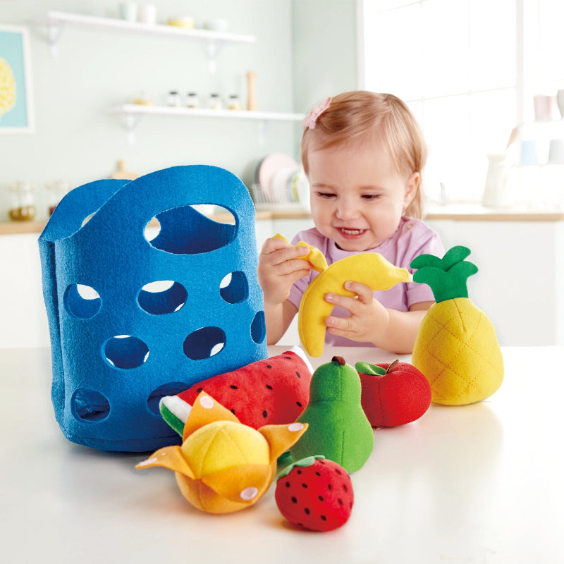 Cesta de fieltro con siete frutas suaves ideales para el juego simbólico temprano. Incluye plátano y naranja pelables, perfectas para compartir y explorar. Favorece el desarrollo sensorial, la motricidad fina y el juego social. Diseñadas con telas suaves, seguras y fáciles de manipular para niños desde los 18 meses.