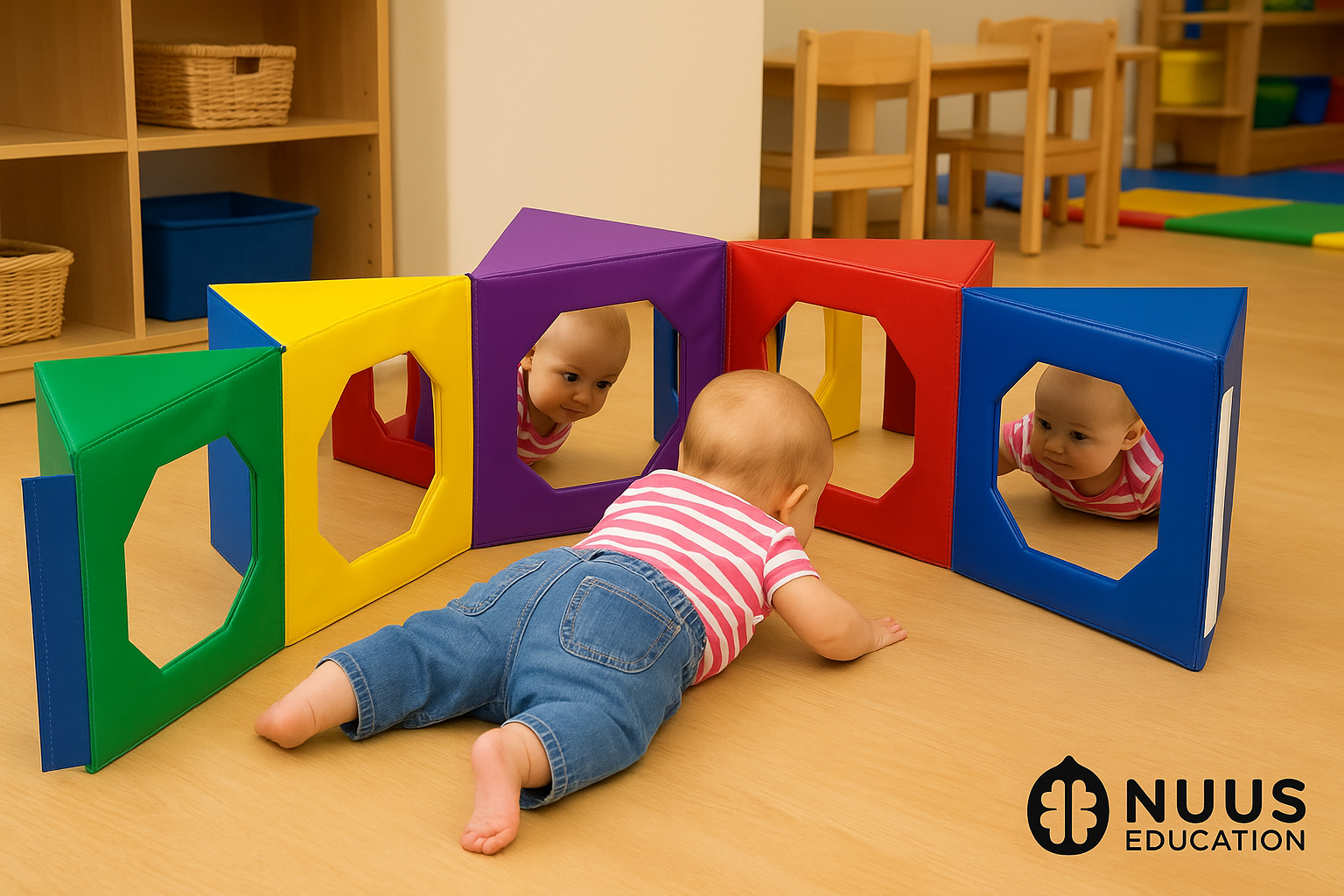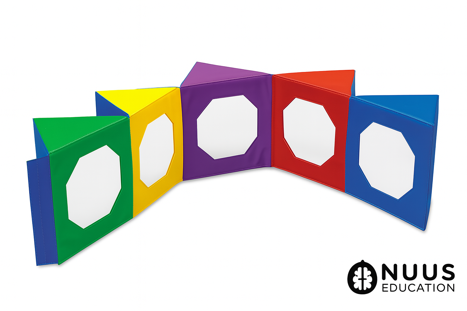 uega con el Espejo es ideal para niños en Sala Cuna. Consiste en una estructura de espuma densa forrada en vinil con 5 espejos irrompibles, ubicados en cada uno de sus triángulos de colores verde, amarillo, morado, rojo y azul, permitiendo que los niños se reflejen en ellos. Al desplegarse, alcanza 1,50 m de longitud; al cerrarse, se convierte en un pentágono.