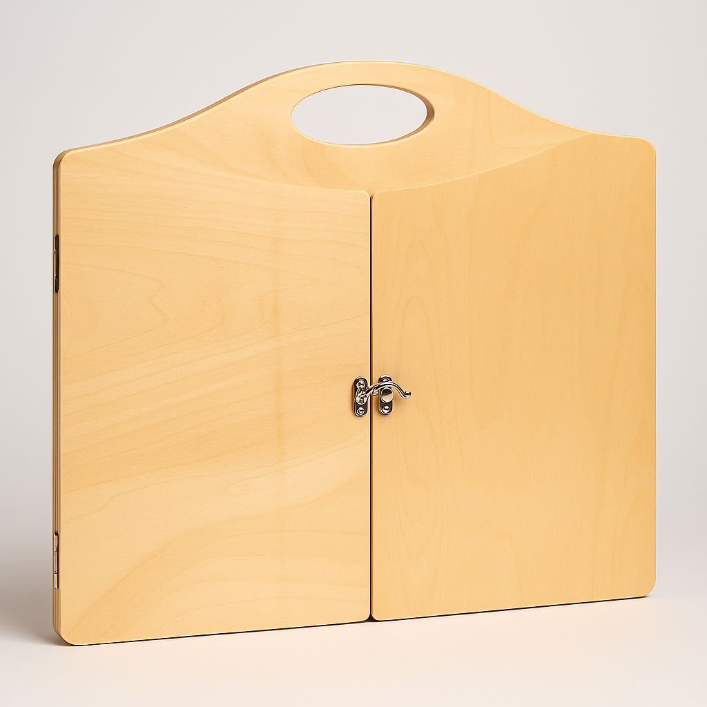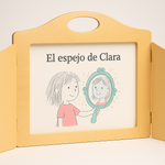 Teatrillo de madera barnizada en color natural, de tres piezas, una central con una parte trasera abierta donde se puede exhibir las láminas y dos laterales unidas por bisagras de metal, medidas mínimas aproximadas mínimas 29 centímetros de alto, 42 centímetros de ancho.